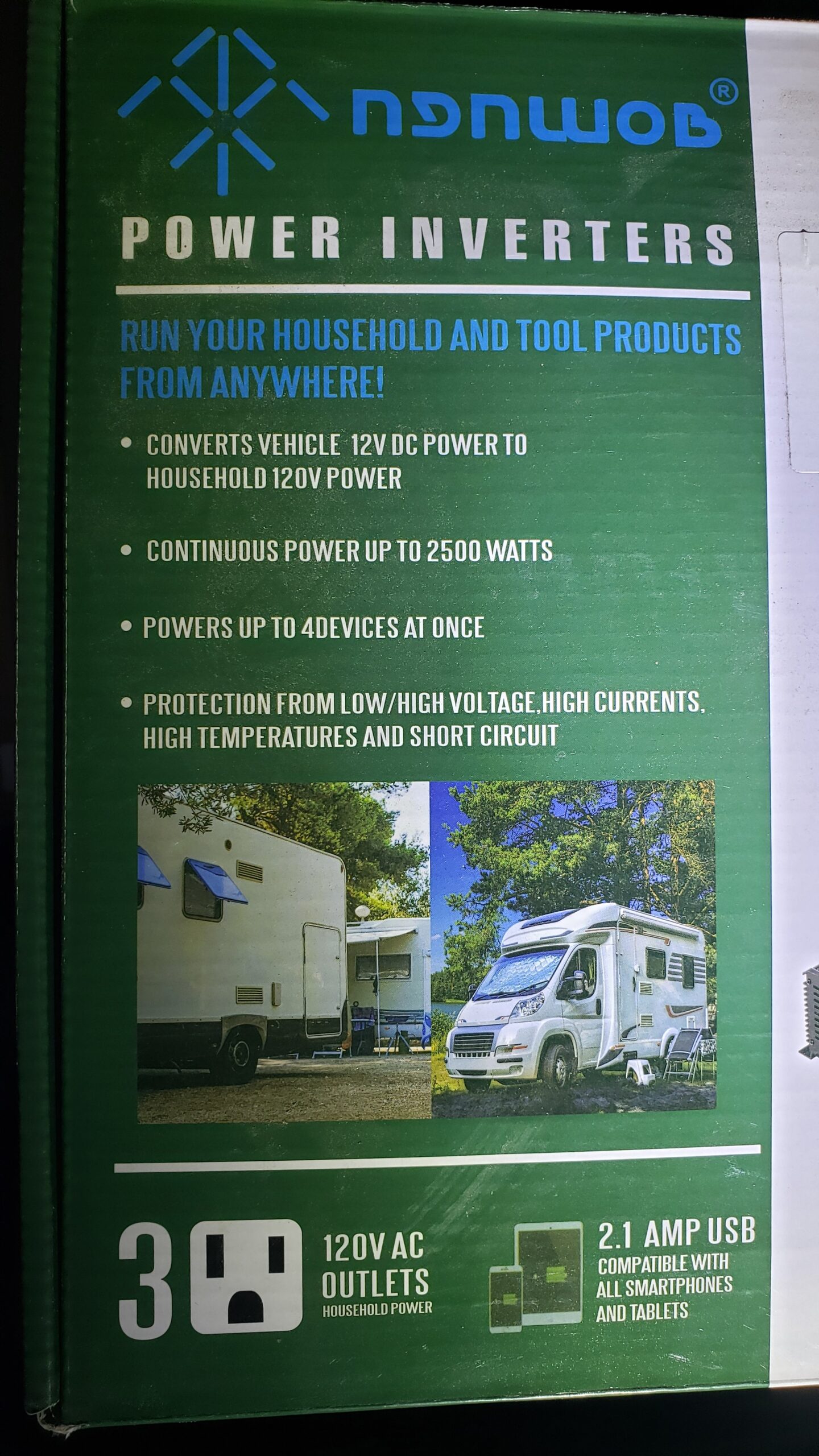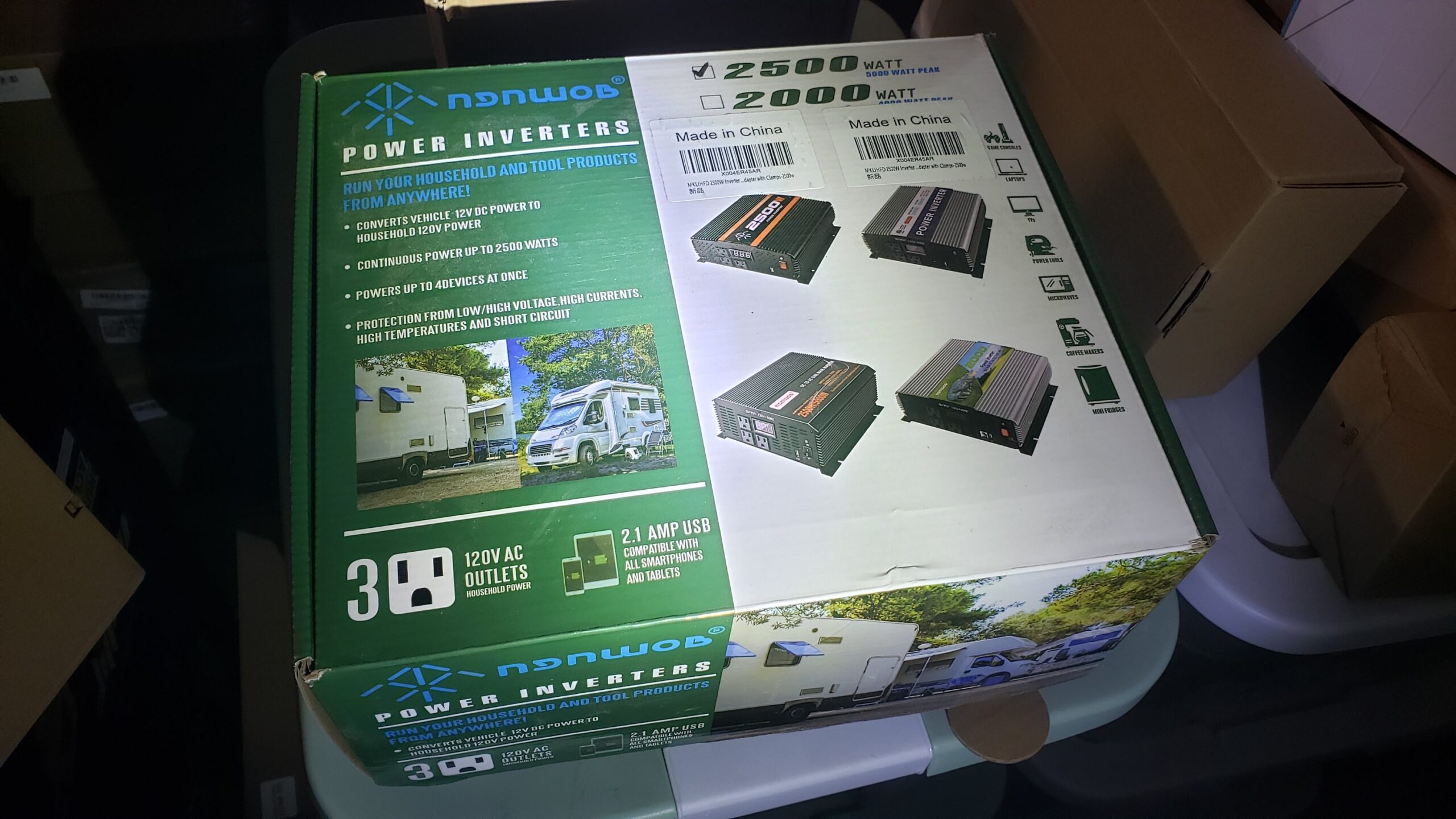 Compact and powerful 2500 Watt inverter for reliable on-the-go AC power, perfect for vehicles, camping, and emergencies.