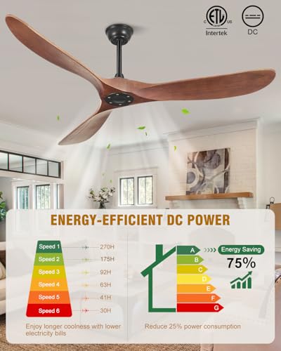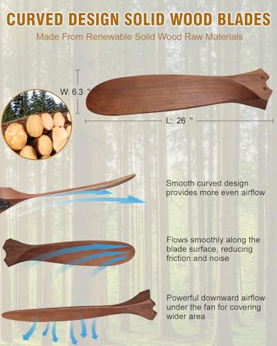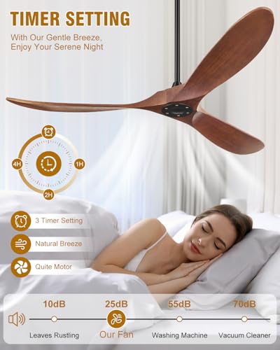 Elevate your indoor and outdoor spaces with our 60-inch ceiling fan without lights. Featuring three exquisitely crafted solid wood blades made from eco-friendly walnut, this fan merges natural elegance with longevity. Its advanced DC motor not only delivers high performance with six adjustable speeds but also operates quietly at under 25 decibels, ensuring a serene environment for all. The fan includes a convenient remote control with three timer settings to help you save energy while keeping comfortable year-round. Designed for flexibility, the installation can be accomplished in under an hour with the included downrods for various ceiling heights. Enhance your porch, patio, bedroom, or home office with this stylish and functional ceiling fan.