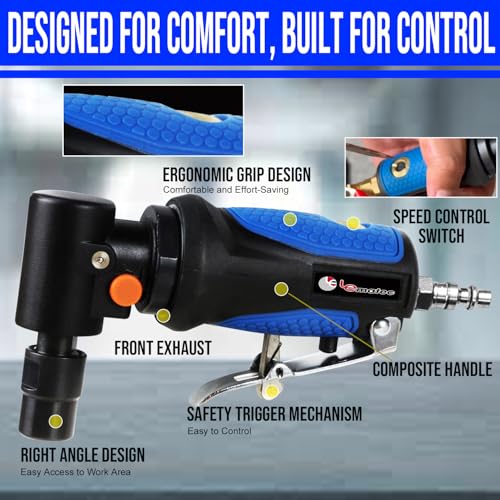Elevate your DIY and professional projects with our High-Speed Air Die Grinder. With a robust operating speed of 18,000 RPM, this lightweight and compact tool is designed for optimal performance in grinding, deburring, and polishing tasks. The quick-change spindle lock feature enables effortless bit swaps, saving you time and ensuring efficiency in every job. Ergonomically designed for comfort, the 90° angled head provides control in confined spaces, making it the perfect addition for automotive repair, metalworking, or home improvement. Constructed from durable alloy steel and aluminum, this air die grinder not only guarantees longevity but also minimizes vibrations for smooth operation. Safety features such as a throttle lock and front exhaust enhance your user experience, ensuring safe and clean performance.